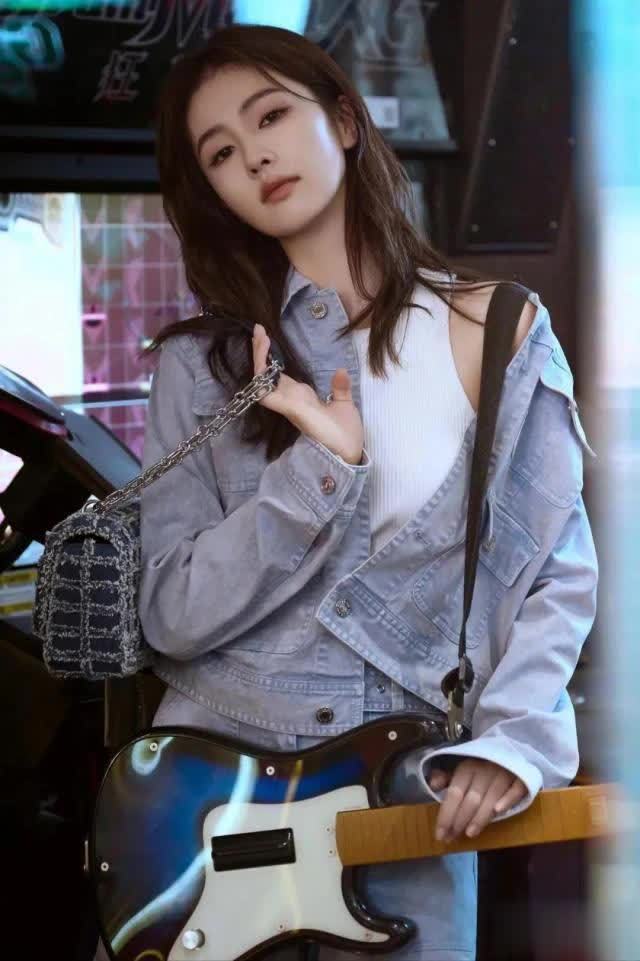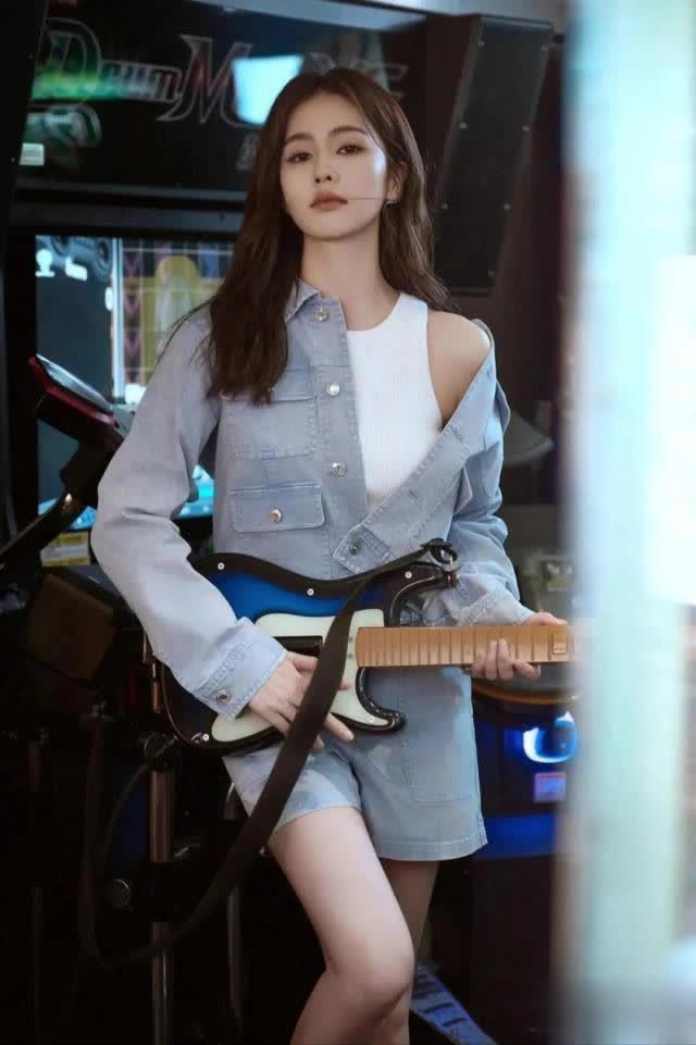 牛仔套装在这一刻有了别样的风情,搭配上吉他的硬朗,展现出她多元的时尚风格。她的眼神坚定而自信,仿佛在告诉大家,时尚就是要不断突破自我。吉他的线条与她的身体曲线相互映衬,每一个姿势都像是经过精心设计的时尚大片。这套穿搭在她的演绎下,既有摇滚的不羁,又有牛仔的率性,将她的独特气质展现得淋漓尽致。