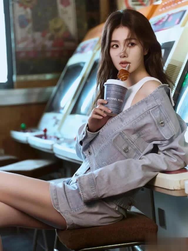 她手持饮料,姿态闲适,双腿交叠间,完美的腿部线条若隐若现,令人羡慕不已。背景中的游戏机闪烁着五彩光芒,却仿佛成了陪衬,她的存在让整个画面都有了焦点。这套穿搭刚柔并济,牛仔的硬朗与白色背心的柔和在她身上达到了奇妙的平衡,尽显时尚品位,仿佛在诉说着一段悠闲的时尚故事。