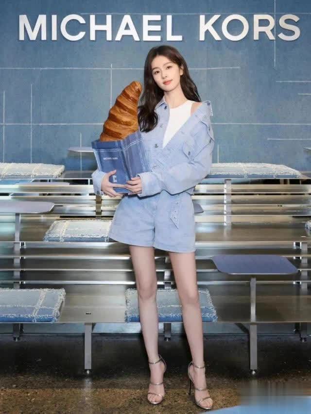 她的笑容甜美如蜜糖,浅蓝色牛仔套装在这样的背景下显得格外亮眼。身材高挑的她,轻松 hold 住这套穿搭,将时尚与美食完美融合。巨大的羊角面包与她的娇小身材形成了有趣的对比,更突显了她的可爱。这一刻,她仿佛是一个从童话世界里走出来的美食精灵,时尚与美食在她身上得到了和谐的统一。