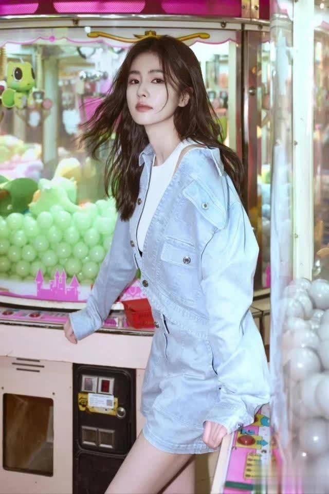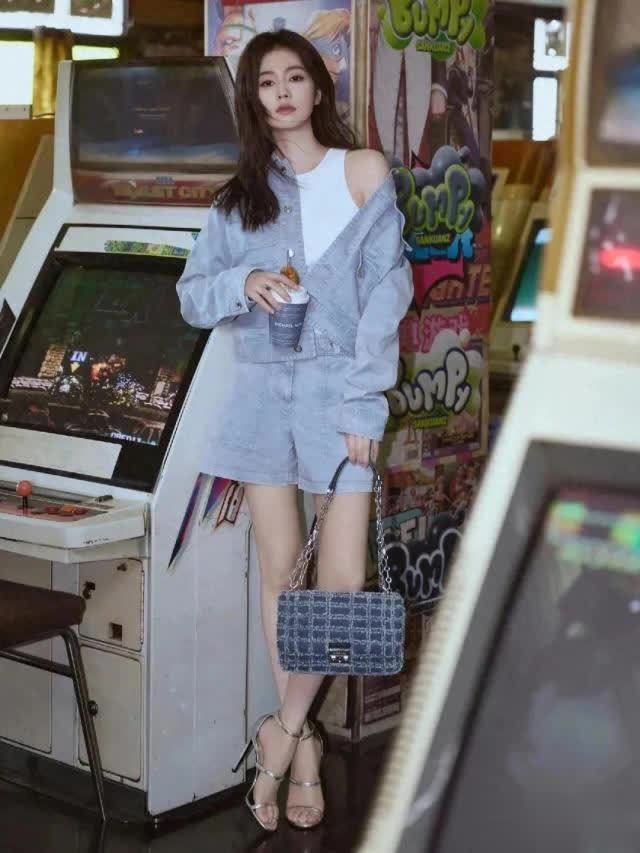 第一张照片中,白鹿置身于充满怀旧气息的游戏厅,浅蓝色牛仔套装搭配白色背心,简约中透着时尚巧思。牛仔外套随性地披着,一侧肩膀若隐若现,为整体造型增添了几分随性与性感。手中的饮料杯上 “MICHAEL KORS” 的标志若隐若现,与精致的链条包相互呼应,脚上的银色高跟鞋更是画龙点睛之笔,将休闲与精致完美融合。她的颜值在暖黄灯光的映照下愈发动人,深邃如星的眼眸、高挺秀美的鼻梁,每一个细节都散发着迷人魅力,仿佛从漫画中走出的时尚精灵,让人移不开目光。